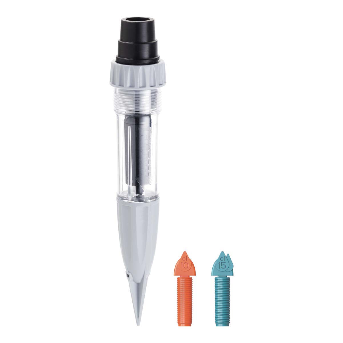 Automatic dripper for pot plants. New conical connector suitable for standard plastic bottles up to 2 litres. Supplied complete with 2 nozzles, rated 10 and 15 cl. The spike is anchored into the soil, near the plant roots. Inspectable and washable under running water.