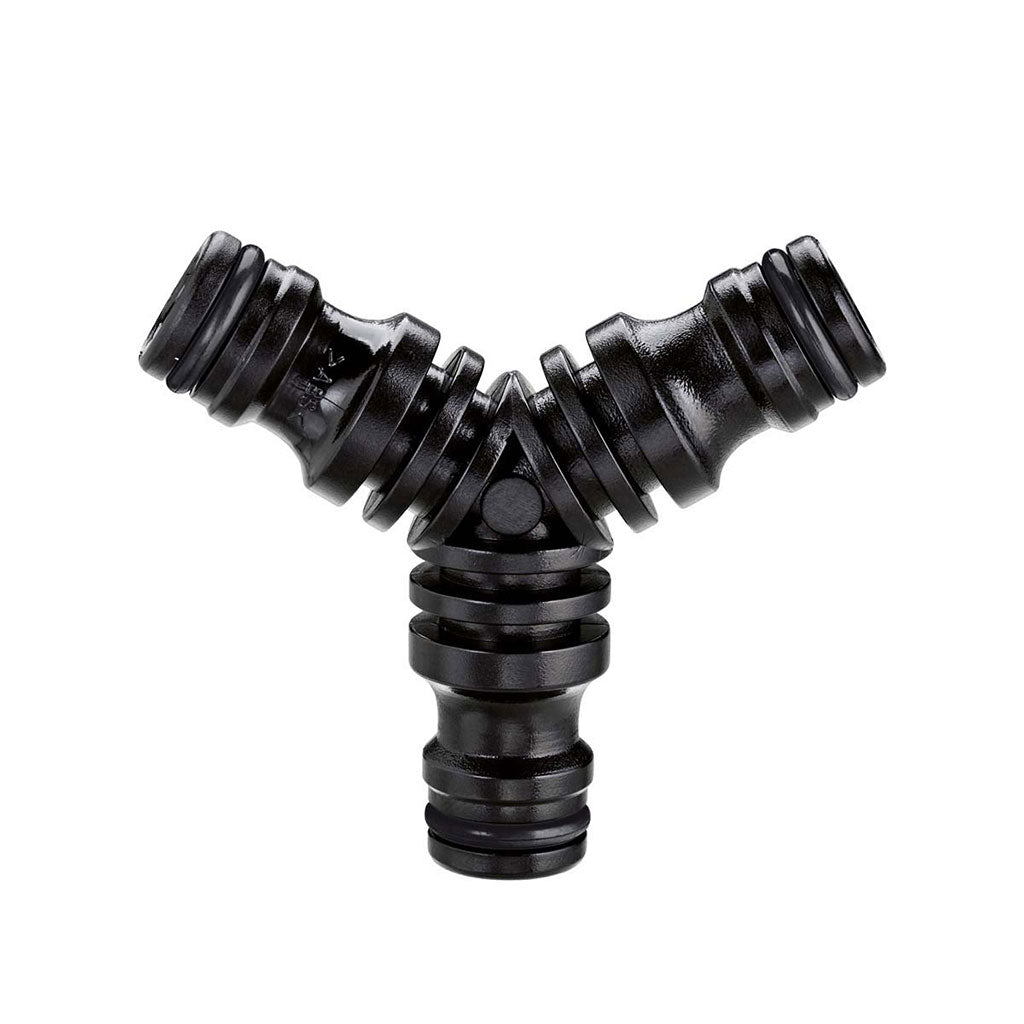Connects three hoses with a ”click” and transforms a single irrigation line into a double line